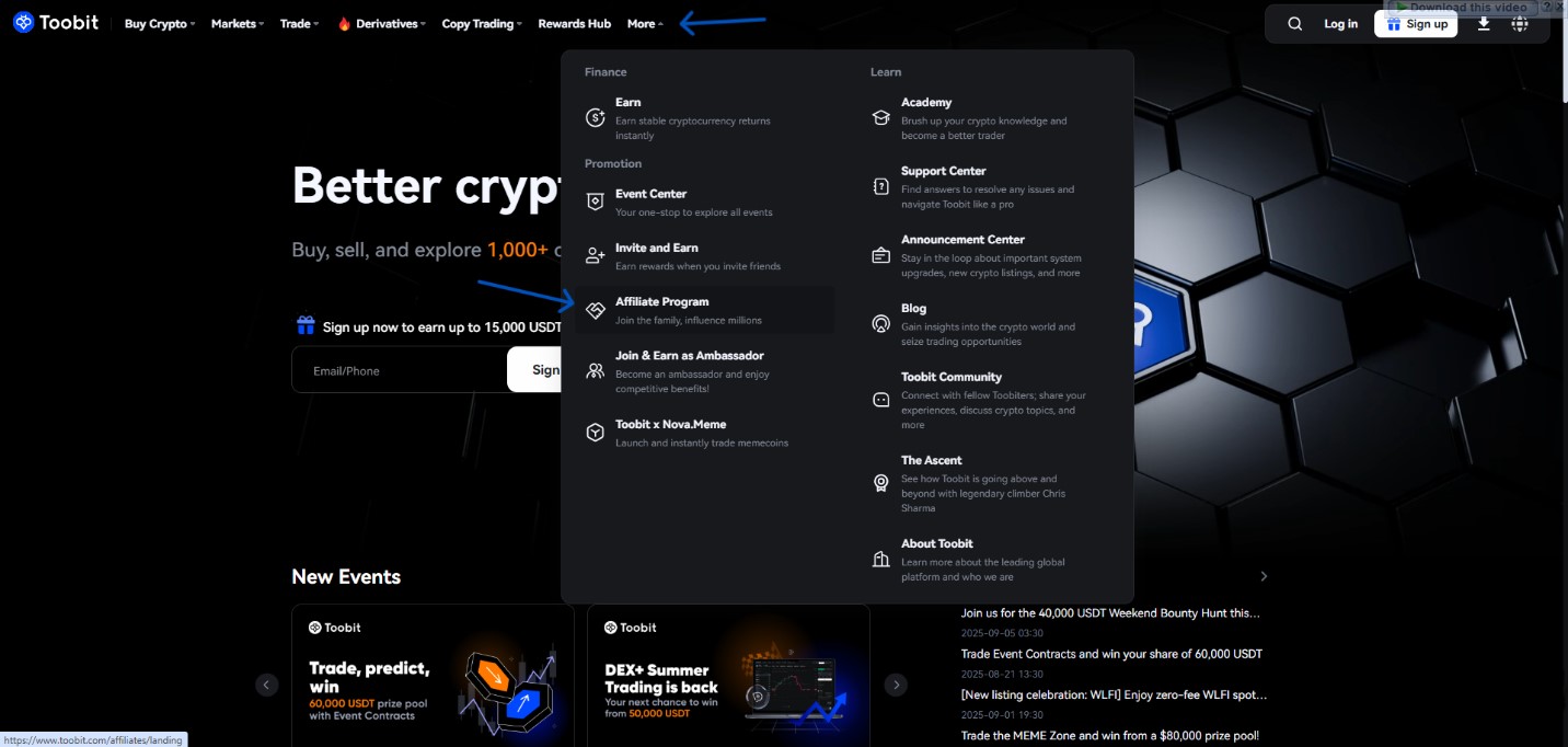 - بعد از آنکه وارد صفحه اصلی سایت صرافی Toobit شدید از بخش More در بالا صفحه، گزینه Affiliate program را انتخاب کنید تا وارد بخش زیر شوید.