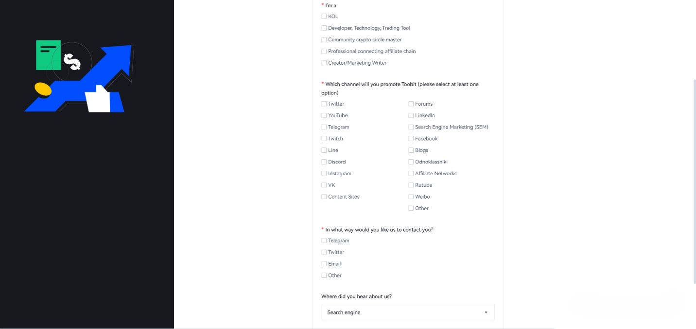 3. در این بخش شما باید باتوجه به سوال پرسیده شده، گزینه مناسب را انتخاب کنید. سوال اول شما باید مشخص کنید که چه شخصی هستید یعنی توسعهدهنده تکنولوژی و یا نویسنده و خلاق بازاریابی و دیگر موارد که باید بهترین گزینه را انتخاب کنید. مورد دوم از شما پرسیده میشود که به چه طریق قرار است صرافی Toobit را تبلیغ کنید و هر گزینهای را که انتخاب میکنید باید آدرس مربوط به همان را هم بنویسید برای بررسی مثلا آدرس پیج اینستاگرام. و مورد سوم این است که شما از چه طریقی مایل هستید با صرافی Toobit تماس داشته باشید و آدرس موردنظر را نیز مینویسید.