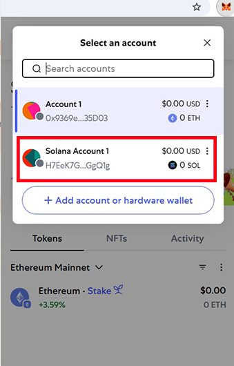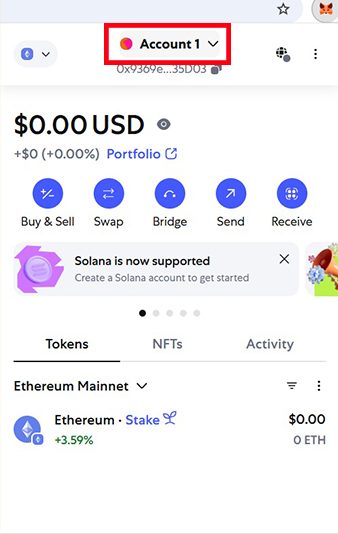 حال وقتی وارد متامسک شوید، پس از انتخاب رمز عبور، از منو بالا میتوانید دو حساب مجزا اتریوم و سولانا خود را مشاهده کنید.
