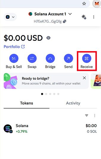 برای افزودن ارز سولانا به کیف پول متامسک، لازم است حتماً از نسخه مرورگر MetaMask استفاده کنید؛ زیرا پشتیبانی از سولانا فقط در جدیدترین نسخه مرورگری این کیف پول فعال شده است.ابتدا افزونه مرورگر متامسک را اجرا کرده و از فهرست داراییها، سولانا را انتخاب کنید. سپس در پایین نمودار قیمتی، روی گزینه «Receive» یا «دریافت» بزنید. در این مرحله میتوانید آدرس سولانای خود را کپی کنید یا با استفاده از QR کد آن را اسکن نمایید.