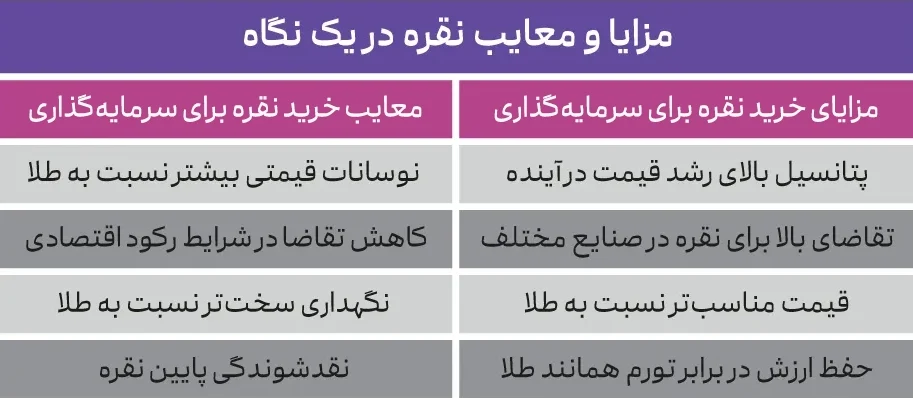 ترکیب قیمت مناسب‌تر و کاربردهای صنعتی گسترده باعث می‌شود نقره در بلندمدت پتانسیل رشد قیمتی قابل توجهی داشته باشد. در جدول زیر می‌توانید مزایا و معایب سرمایه‌گذاری در نقره را به‌صورت خلاصه و مقایسه‌ای مشاهده کنید.