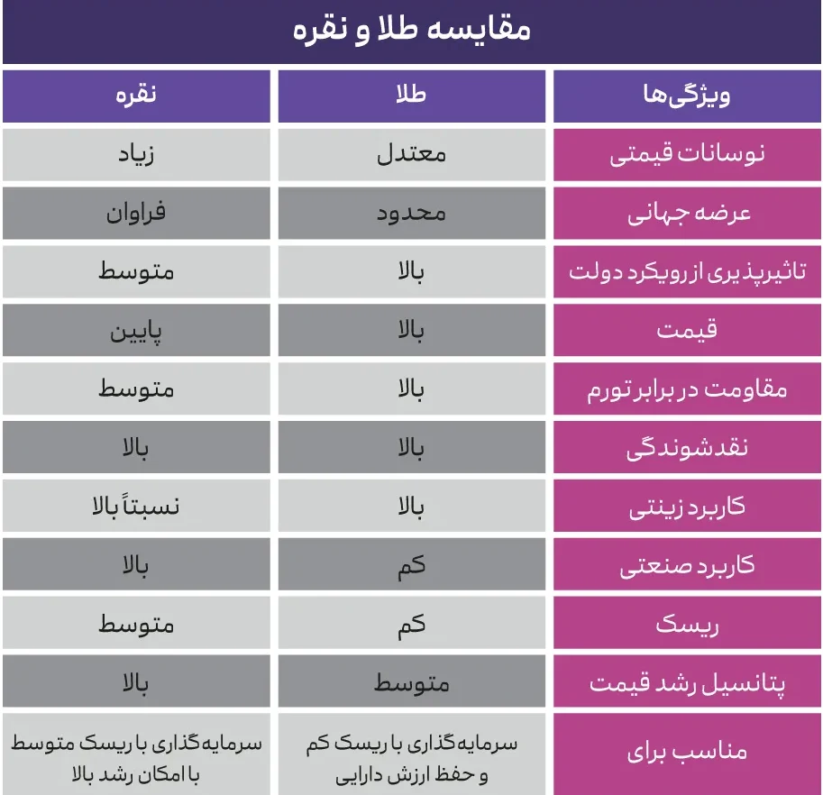 قبل از اینکه وارد جزئیات بیشتری از طلا و نقره شویم، بهتر است این فلز گرانبها را با هم مقایسه کنیم. جدول زیر مقایسه‌ی خوبی از طلا و نقره را ارائه داده است. این مقایسه از جهات مختلف انجام شده است.