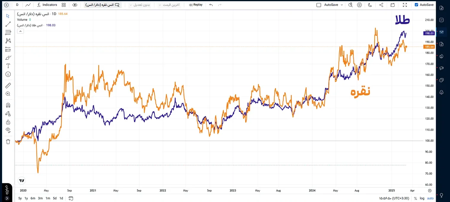 برای بررسی عملکرد قیمتی طلا و نقره، نمودار هر دو دارایی بر مبنای دلار بر اونس در تصویر زیر ارائه شده و مورد مقایسه قرار گرفته است. هرچند قیمت نقره در مقایسه با طلا به‌مراتب پایین‌تر است، اما از نظر میزان رشد و بازدهی، توانسته جایگاه قابل توجهی پیدا کند و خود را به‌عنوان رقیبی جدی برای طلا مطرح سازد. با مشاهده تصویر زیر می‌توان تفاوت و شباهت روند رشد این دو فلز گران‌بها را بهتر درک کرد.