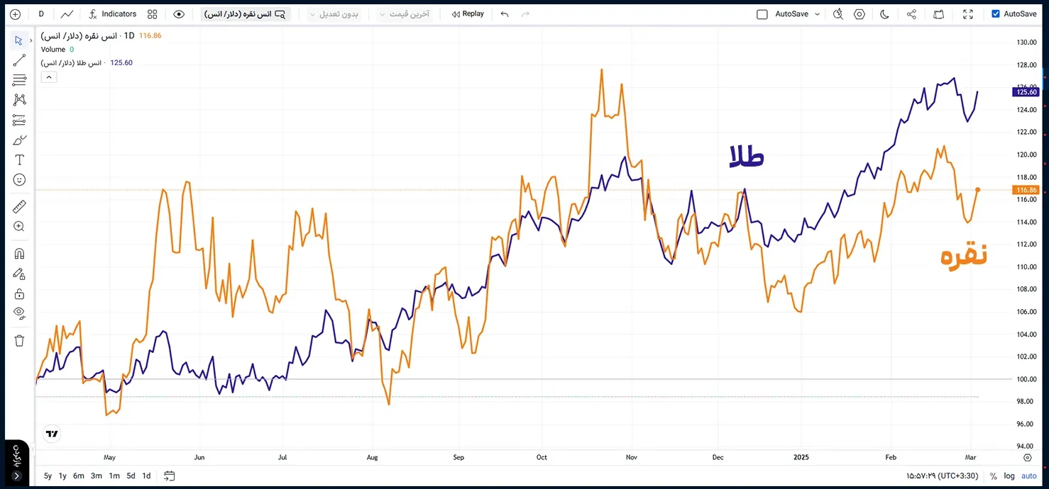 تصویر بعدی مقایسه شفاف‌تری از عملکرد این دو فلز گران‌بها ارائه می‌دهد؛ چرا که روند قیمتی طلا و نقره را از ابتدای سال ۱۴۰۳ بررسی می‌کند و امکان ارزیابی دقیق‌تری از رفتار اخیر آن‌ها در بازار فراهم می‌سازد.
