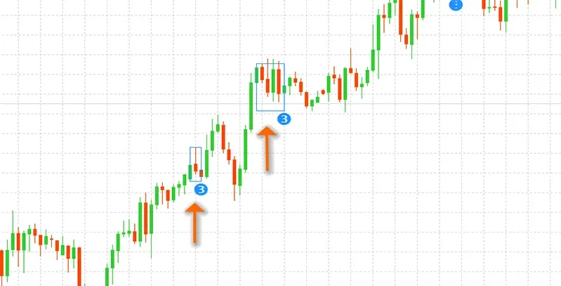 در تنظیمات پیشفرض، اندیکاتور از سه الگوی اصلاحی مشخص بهره میبرد. هر زمان یکی از این الگوها با توجه به تعداد معینی از کندلها در یک ناحیه شکل بگیرد، آن ناحیه با یک کادر رنگی نمایش داده میشود؛ کادر آبی در روندهای صعودی و کادر قرمز در روندهای نزولی. علاوه بر این، یک فلش همجهت با روند ظاهر میشود که احتمال ادامه حرکت قیمت در همان جهت را نشان میدهد. نکته مهم این است که این نواحی معمولاً برای ورود همجهت با روند اصلی مناسب هستند و نباید بهعنوان نقاط بازگشت روند در نظر گرفته شوند.