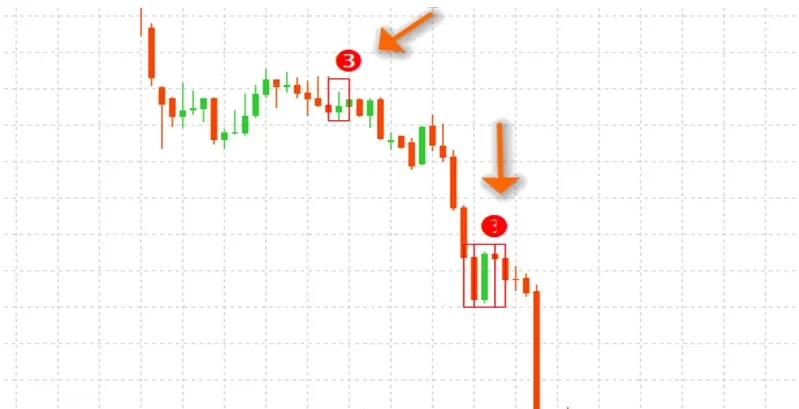 در یک روند نزولی، زمانی که اندیکاتور کادر قرمز بههمراه فلشی رو به پایین نمایش میدهد، این موضوع نشاندهنده احتمال ادامه حرکت نزولی قیمت است. در چنین شرایطی، پیش از هر اقدامی باید اطمینان حاصل شود که ساختار کلی بازار نزولی بوده و سقفها و کفهای پایینتر بهصورت منظم در حال شکلگیری هستند.