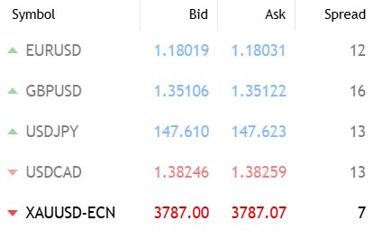 طبق تصویر اسپردها در حساب ECN از 0.7 پیپ در نماد طلا شروع شده و تا 1.6 پیپ در نماد پوند انگلستان / دلار آمریکا ادامه دارد.