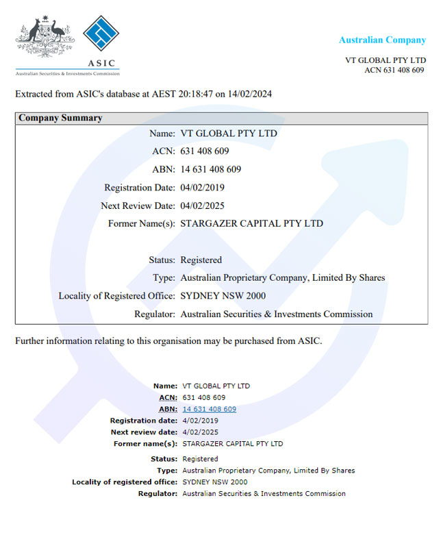 اولین رگولاتور بروکر وی تی مارکتس یک رگولاتور سطح ۱ و معتبر است. این شرکت تحت نام تجاری VT Global Pty Ltd توسط کمیسیون اوراق بهادار و سرمایهگذاری استرالیا (ASIC) مجوز و نظارت میشود. همچنین، این بروکر دارای مجوز خدمات مالی استرالیا با شماره مجوز 516246 است.