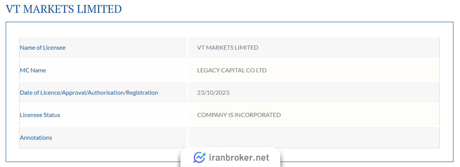 علاوه بر دو رگوله بالا، بروکر وی تی مارکتز دو رگوله آفشور نیز دارد که در ادامه به آنها اشاره خواهیم کرد.بروکر VTMarkets توسط کمیسیون خدمات مالی موریس (FSC) رگوله و ثبت شده است. استعلام این مجوز ثبت را در زیر مشاهده میکنید.
